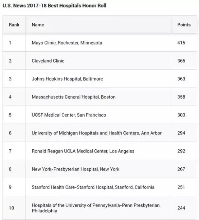 排名第二和第三的分别是克利夫兰医学中心和约翰·霍普金斯医院,麻省总医院则从去年的第三名滑落至第四,总分358。