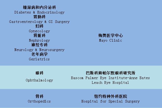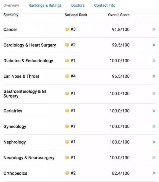 今年,梅奥本部不但以超领先的比分蝉联综合第一的荣誉,同时获得了6个专科第一:糖尿病与内分泌科、胃肠内外科、老年病科、妇科、肾内科、神经内外科;心脏内外科、骨科、肺病科和泌尿外科4个专科排名第二;癌症排名第三,耳鼻喉排名第四。