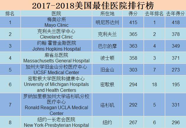 今年是《美国新闻与世界报道》杂志第28次“最佳医院”排名,通过评估分析全美4500个医疗机构的综合数据,以满分480的比分,最终评选出了“最佳医院”荣誉榜前20名。