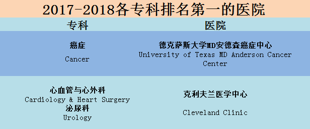 虽然排名未变,但梅奥医学中心和克利夫兰医学中心的得分都低于去年。其原因可能是梅奥失掉了两个专科第一的位置,而约翰·霍普金斯医院由于拿到了风湿病和耳鼻喉两个专科的排名第一,一举超过麻省总医院,跃居第三。